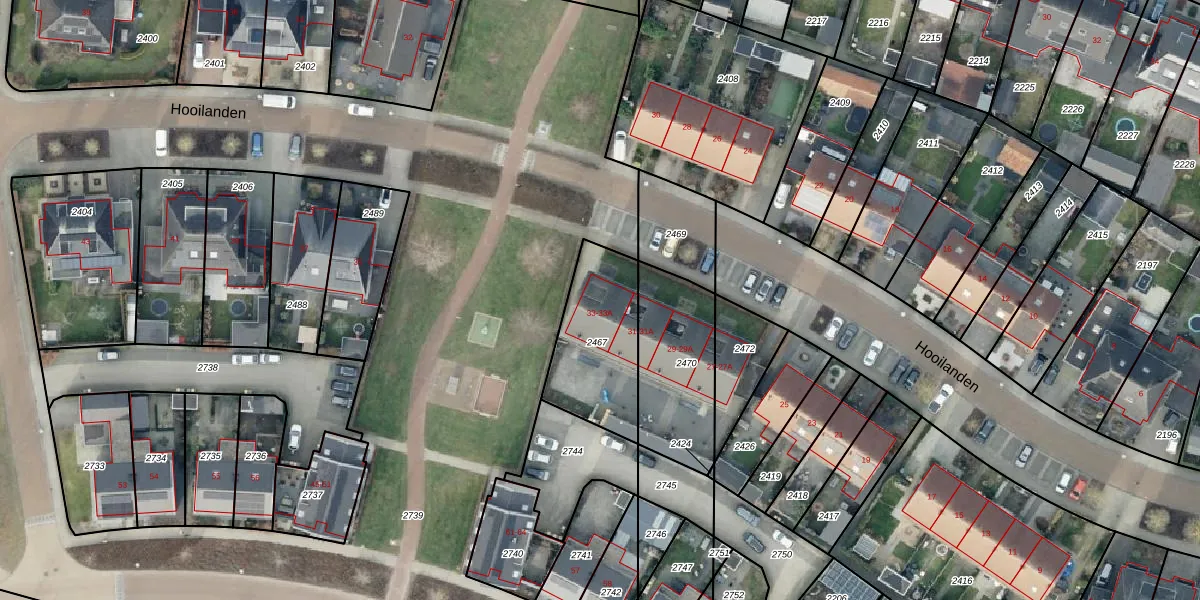 Het perceel waarop Hooilanden 33 staat heeft een oppervlakte van 385 m². Dit is een groot perceel. De perceeloppervlakte wordt geregistreerd door het Kadaster. Gedetailleerde informatie over de maten van dit perceel kunt u vinden in het rapport Kadastrale kaart met maatvoering van Hooilanden 33.