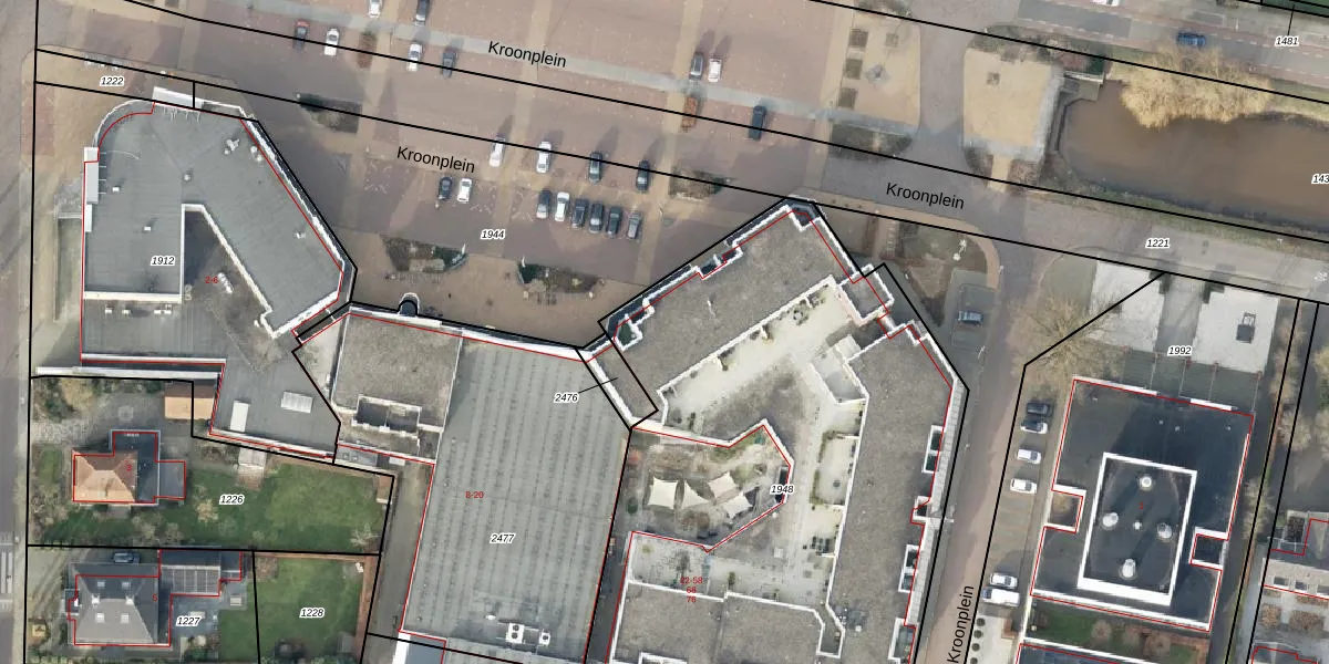 Het perceel waarop Kroonplein 22 staat heeft een oppervlakte van 3297 m². Dit is een zeer groot perceel. De perceeloppervlakte wordt geregistreerd door het Kadaster. Gedetailleerde informatie over de maten van dit perceel kunt u vinden in het rapport Kadastrale kaart met maatvoering van Kroonplein 22.