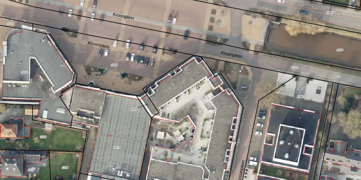 Het perceel waarop Kroonplein 32 staat heeft een oppervlakte van 3297 m². Dit is een zeer groot perceel. De perceeloppervlakte wordt geregistreerd door het Kadaster. Gedetailleerde informatie over de maten van dit perceel kunt u vinden in het rapport Kadastrale kaart met maatvoering van Kroonplein 32.