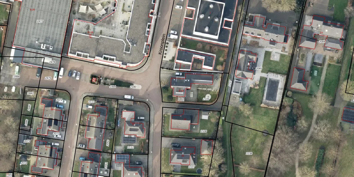 Het perceel waarop Kroonplein 5 staat heeft een oppervlakte van 614 m². Dit is een groot perceel. De perceeloppervlakte wordt geregistreerd door het Kadaster. Gedetailleerde informatie over de maten van dit perceel kunt u vinden in het rapport Kadastrale kaart met maatvoering van Kroonplein 5.
