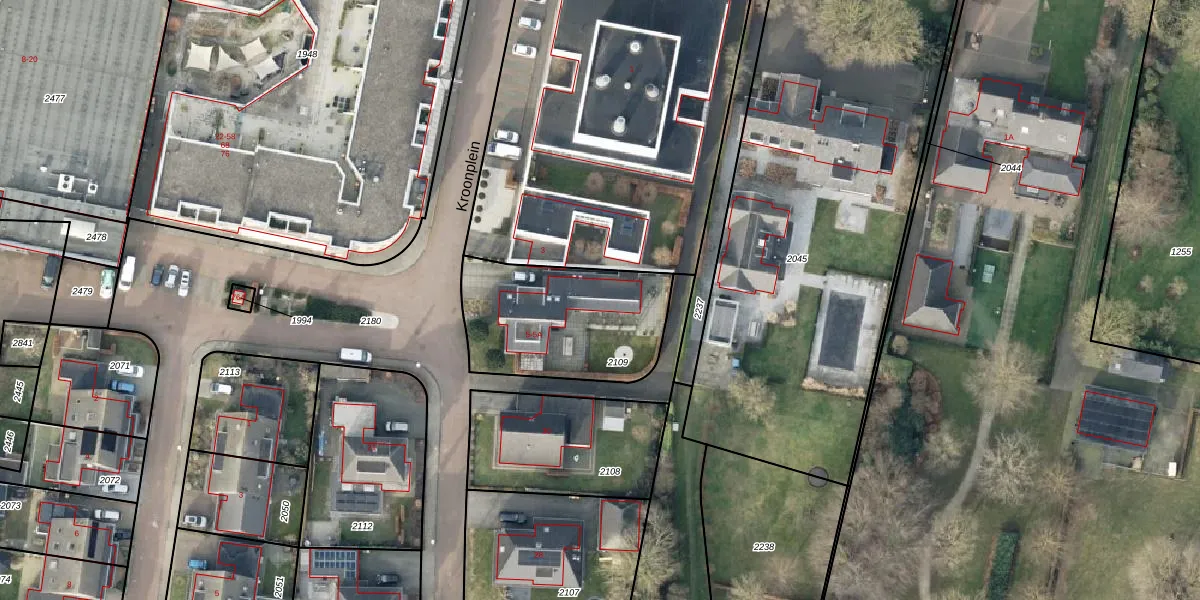 Het perceel waarop Kroonplein 5-A staat heeft een oppervlakte van 614 m². Dit is een groot perceel. De perceeloppervlakte wordt geregistreerd door het Kadaster. Gedetailleerde informatie over de maten van dit perceel kunt u vinden in het rapport Kadastrale kaart met maatvoering van Kroonplein 5-A.