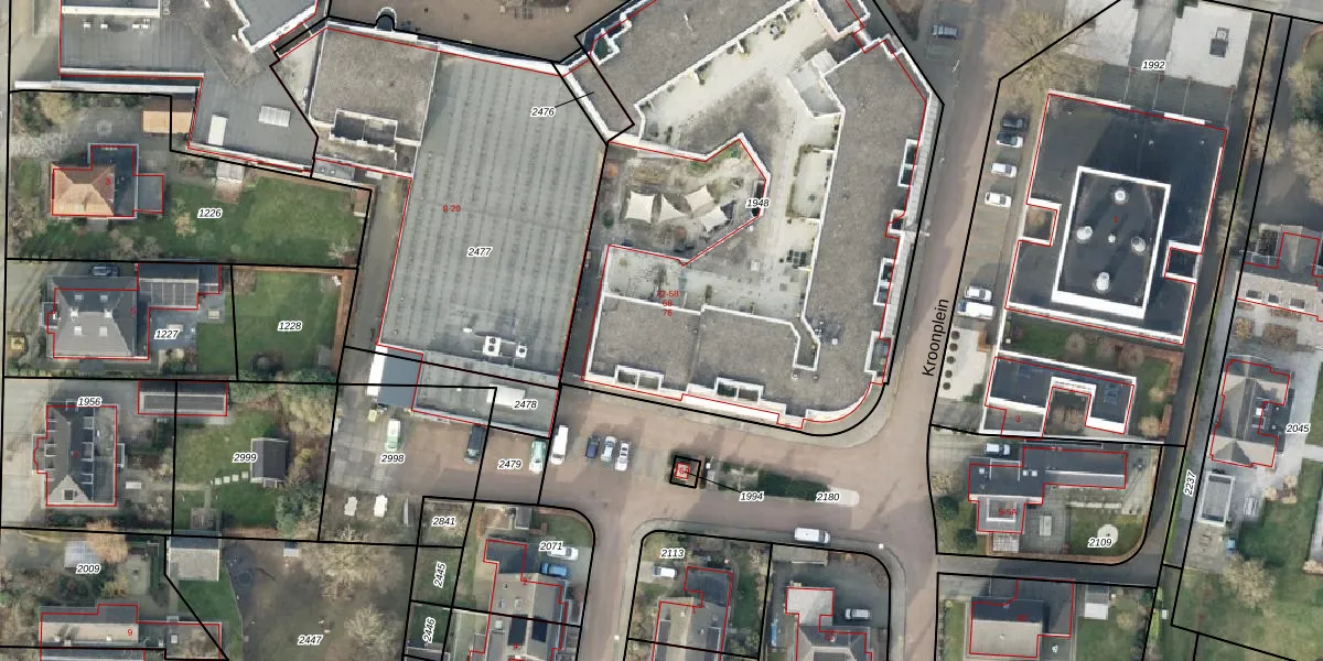 Het perceel waarop Kroonplein 54 staat heeft een oppervlakte van 3297 m². Dit is een zeer groot perceel. De perceeloppervlakte wordt geregistreerd door het Kadaster. Gedetailleerde informatie over de maten van dit perceel kunt u vinden in het rapport Kadastrale kaart met maatvoering van Kroonplein 54.