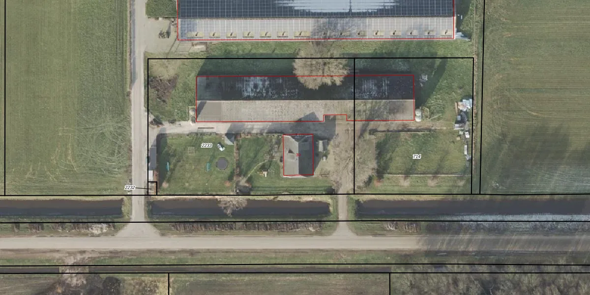 Het perceel waarop Langsweg 30 staat heeft een oppervlakte van 3215 m². Dit is een zeer groot perceel. De perceeloppervlakte wordt geregistreerd door het Kadaster. Gedetailleerde informatie over de maten van dit perceel kunt u vinden in het rapport Kadastrale kaart met maatvoering van Langsweg 30.