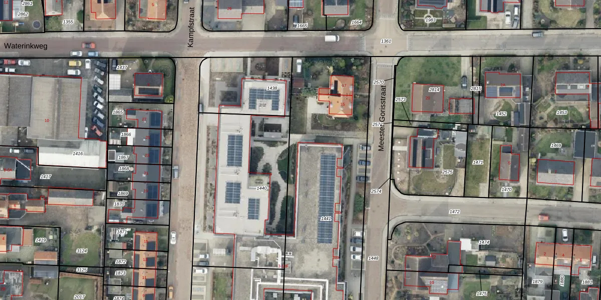 Het perceel waarop Meester Gorisstraat 13-F staat heeft een oppervlakte van 2600 m². Dit is een zeer groot perceel. De perceeloppervlakte wordt geregistreerd door het Kadaster. Gedetailleerde informatie over de maten van dit perceel kunt u vinden in het rapport Kadastrale kaart met maatvoering van Meester Gorisstraat 13-F.