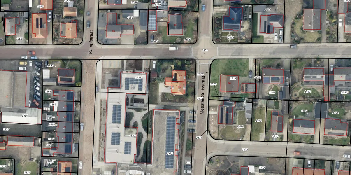 Het perceel waarop Meester Gorisstraat 15 staat heeft een oppervlakte van 2600 m². Dit is een zeer groot perceel. De perceeloppervlakte wordt geregistreerd door het Kadaster. Gedetailleerde informatie over de maten van dit perceel kunt u vinden in het rapport Kadastrale kaart met maatvoering van Meester Gorisstraat 15.