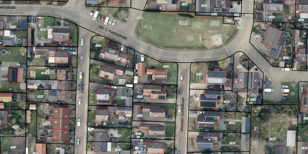 Het perceel waarop Meester Gorisstraat 29 staat heeft een oppervlakte van 473 m². Dit is een groot perceel. De perceeloppervlakte wordt geregistreerd door het Kadaster. Gedetailleerde informatie over de maten van dit perceel kunt u vinden in het rapport Kadastrale kaart met maatvoering van Meester Gorisstraat 29.