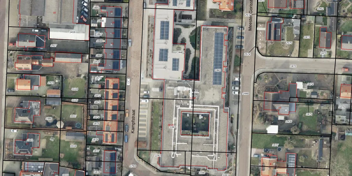 Het perceel waarop Meester Gorisstraat 9-A staat heeft een oppervlakte van 1560 m². Dit is een zeer groot perceel. De perceeloppervlakte wordt geregistreerd door het Kadaster. Gedetailleerde informatie over de maten van dit perceel kunt u vinden in het rapport Kadastrale kaart met maatvoering van Meester Gorisstraat 9-A.