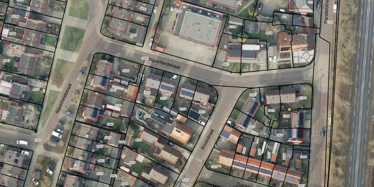 Het perceel waarop Nijverheidstraat 7 staat heeft een oppervlakte van 199 m². Dit is een middelgroot perceel. De perceeloppervlakte wordt geregistreerd door het Kadaster. Gedetailleerde informatie over de maten van dit perceel kunt u vinden in het rapport Kadastrale kaart met maatvoering van Nijverheidstraat 7.