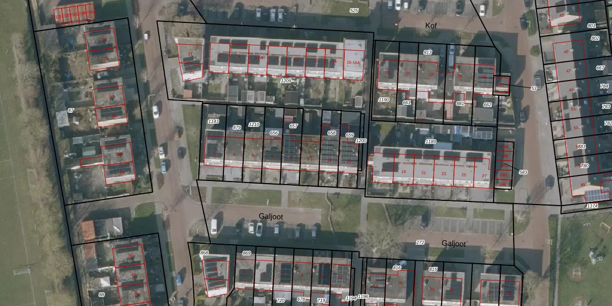 Het perceel waarop Galjoot 11 staat heeft een oppervlakte van 1990 m². Dit is een zeer groot perceel. De perceeloppervlakte wordt geregistreerd door het Kadaster. Gedetailleerde informatie over de maten van dit perceel kunt u vinden in het rapport Kadastrale kaart met maatvoering van Galjoot 11.