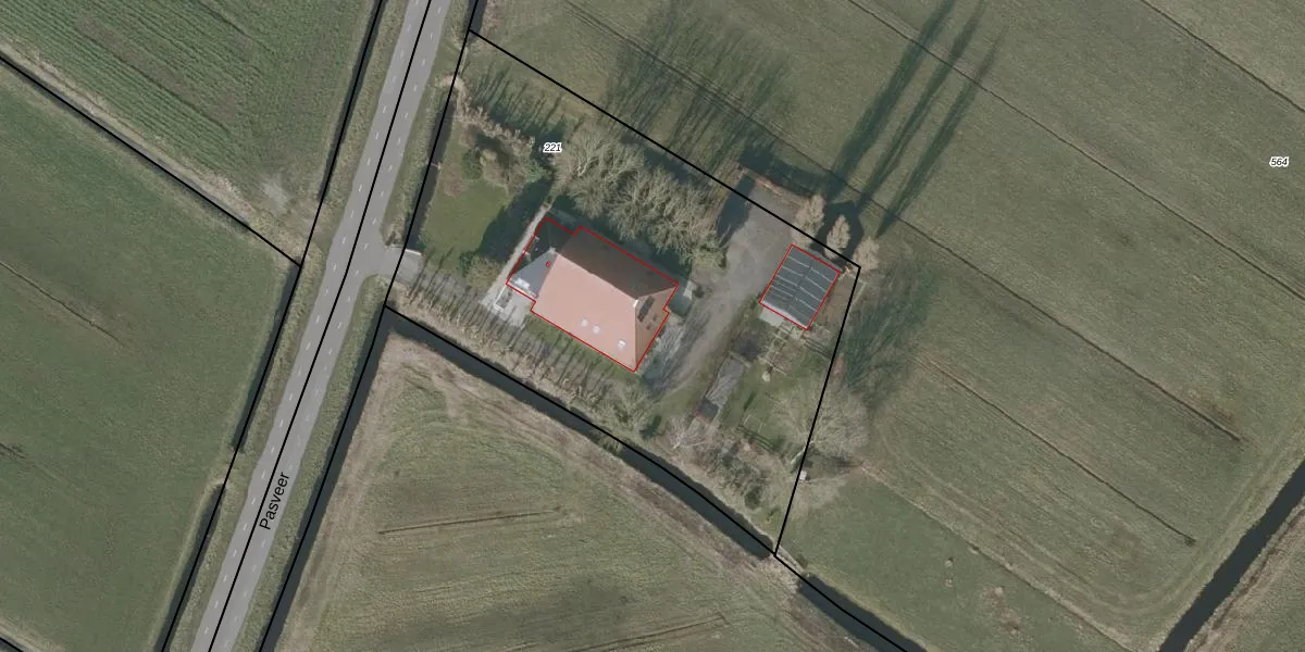 Het perceel waarop Pasveer 6 staat heeft een oppervlakte van 2985 m². Dit is een zeer groot perceel. De perceeloppervlakte wordt geregistreerd door het Kadaster. Gedetailleerde informatie over de maten van dit perceel kunt u vinden in het rapport Kadastrale kaart met maatvoering van Pasveer 6.
