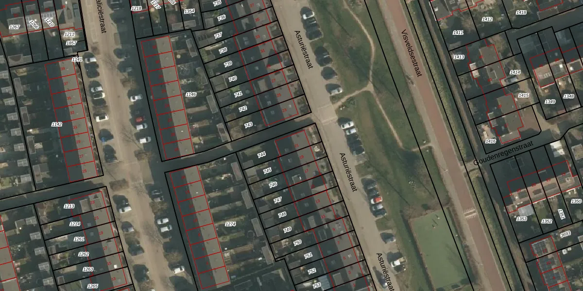 Het perceel waarop Asturiëstraat 21 staat heeft een oppervlakte van 187 m². Dit is een middelgroot perceel. De perceeloppervlakte wordt geregistreerd door het Kadaster. Gedetailleerde informatie over de maten van dit perceel kunt u vinden in het rapport Kadastrale kaart met maatvoering van Asturiëstraat 21.