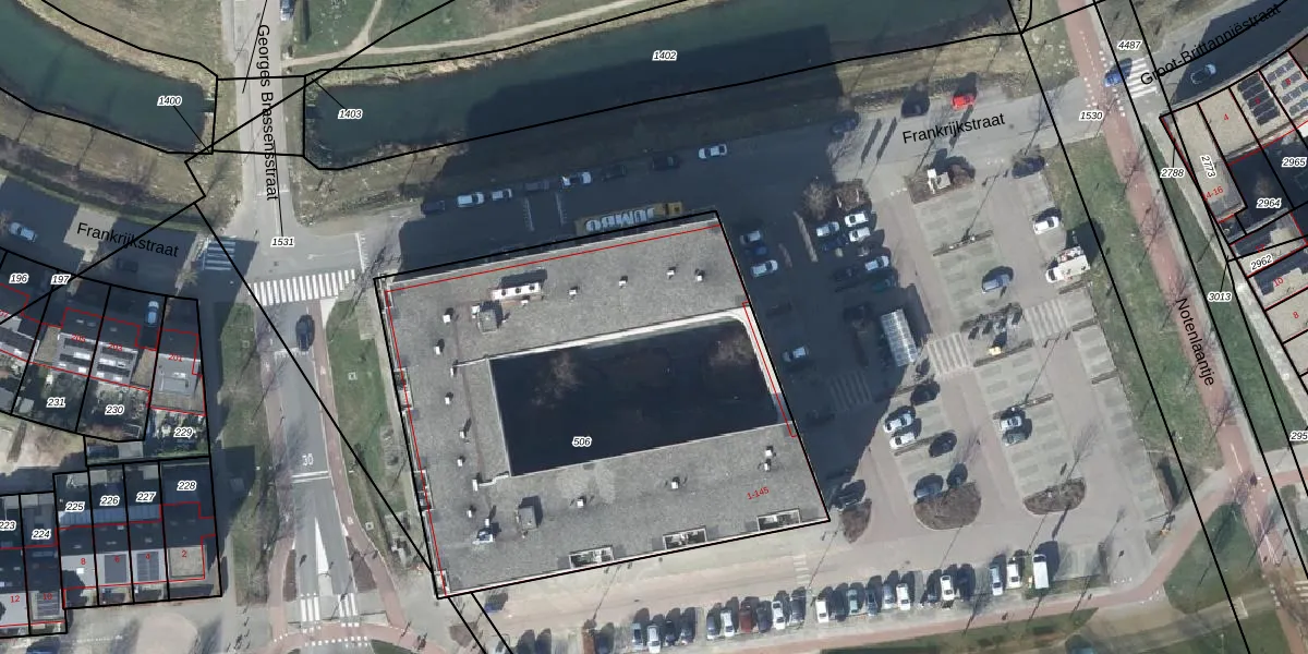 Het perceel waarop Frankrijkstraat 101 staat heeft een oppervlakte van 2855 m². Dit is een zeer groot perceel. De perceeloppervlakte wordt geregistreerd door het Kadaster. Gedetailleerde informatie over de maten van dit perceel kunt u vinden in het rapport Kadastrale kaart met maatvoering van Frankrijkstraat 101.