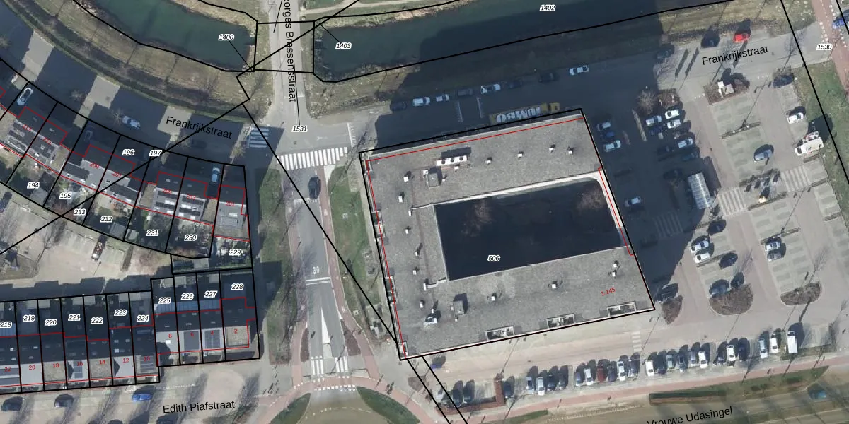 Het perceel waarop Frankrijkstraat 55 staat heeft een oppervlakte van 2855 m². Dit is een zeer groot perceel. De perceeloppervlakte wordt geregistreerd door het Kadaster. Gedetailleerde informatie over de maten van dit perceel kunt u vinden in het rapport Kadastrale kaart met maatvoering van Frankrijkstraat 55.