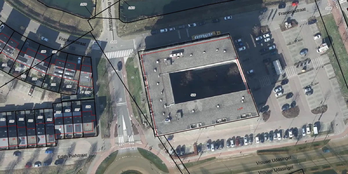 Het perceel waarop Frankrijkstraat 87 staat heeft een oppervlakte van 2855 m². Dit is een zeer groot perceel. De perceeloppervlakte wordt geregistreerd door het Kadaster. Gedetailleerde informatie over de maten van dit perceel kunt u vinden in het rapport Kadastrale kaart met maatvoering van Frankrijkstraat 87.