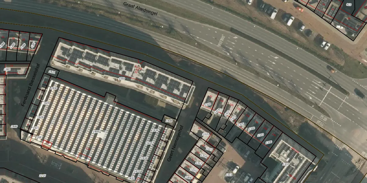 Het perceel waarop Graaf Alardsingel 100 staat heeft een oppervlakte van 1825 m². Dit is een zeer groot perceel. De perceeloppervlakte wordt geregistreerd door het Kadaster. Gedetailleerde informatie over de maten van dit perceel kunt u vinden in het rapport Kadastrale kaart met maatvoering van Graaf Alardsingel 100.