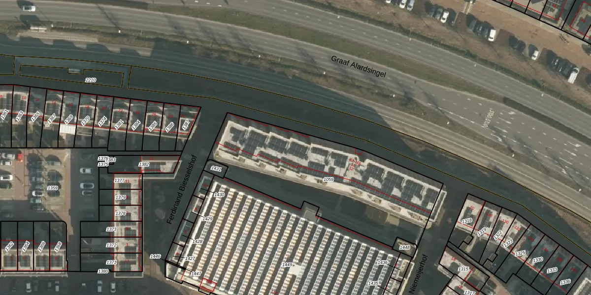 Het perceel waarop Graaf Alardsingel 70 staat heeft een oppervlakte van 1825 m². Dit is een zeer groot perceel. De perceeloppervlakte wordt geregistreerd door het Kadaster. Gedetailleerde informatie over de maten van dit perceel kunt u vinden in het rapport Kadastrale kaart met maatvoering van Graaf Alardsingel 70.