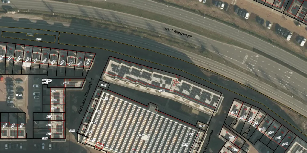 Het perceel waarop Graaf Alardsingel 72 staat heeft een oppervlakte van 1825 m². Dit is een zeer groot perceel. De perceeloppervlakte wordt geregistreerd door het Kadaster. Gedetailleerde informatie over de maten van dit perceel kunt u vinden in het rapport Kadastrale kaart met maatvoering van Graaf Alardsingel 72.