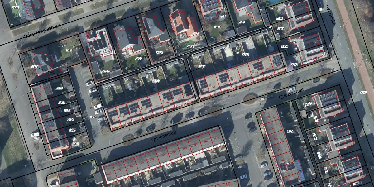 Het perceel waarop Queenstraat 53 staat heeft een oppervlakte van 1214 m². Dit is een zeer groot perceel. De perceeloppervlakte wordt geregistreerd door het Kadaster. Gedetailleerde informatie over de maten van dit perceel kunt u vinden in het rapport Kadastrale kaart met maatvoering van Queenstraat 53.