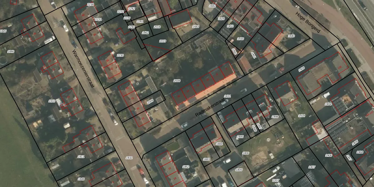 Het perceel waarop Radmakerstraat 14 staat heeft een oppervlakte van 2005 m². Dit is een zeer groot perceel. De perceeloppervlakte wordt geregistreerd door het Kadaster. Gedetailleerde informatie over de maten van dit perceel kunt u vinden in het rapport Kadastrale kaart met maatvoering van Radmakerstraat 14.