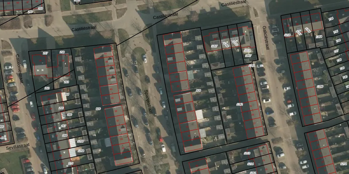 Het perceel waarop Spanjestraat 40 staat heeft een oppervlakte van 1880 m². Dit is een zeer groot perceel. De perceeloppervlakte wordt geregistreerd door het Kadaster. Gedetailleerde informatie over de maten van dit perceel kunt u vinden in het rapport Kadastrale kaart met maatvoering van Spanjestraat 40.