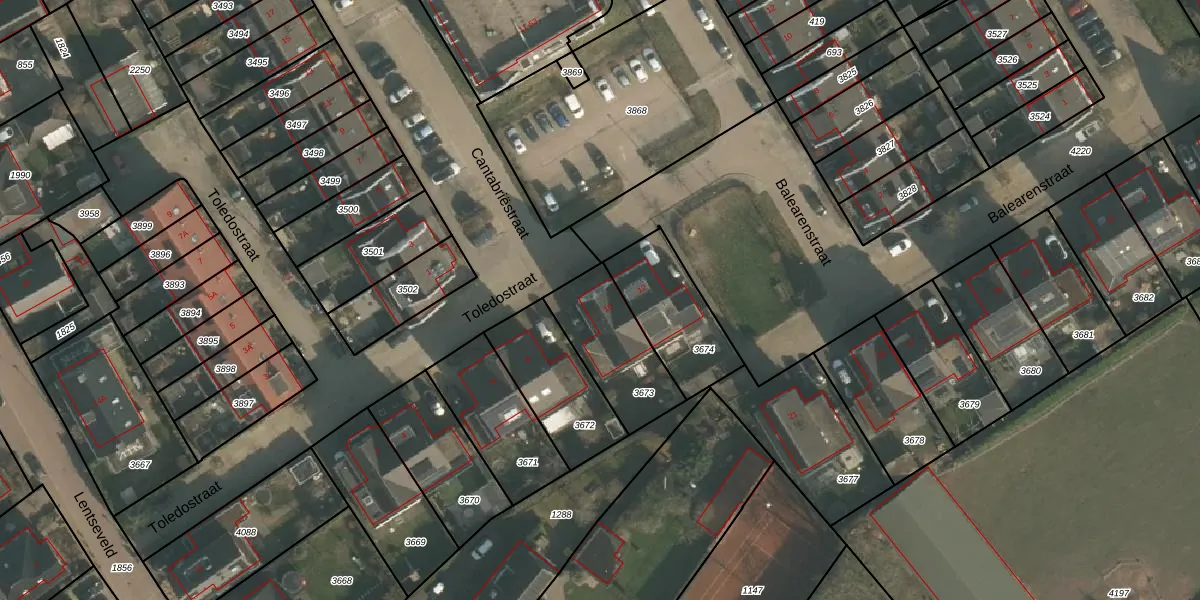 Toledostraat 10 is gelegen op kadastraal perceel LEN00A3673. Deze kadastrale aanduiding is uniek en wordt gebruikt door het Kadaster om eigendomsrechten en andere zakelijke rechten vast te leggen. Het perceel maakt onderdeel uit van de kadastrale gemeente Lent.