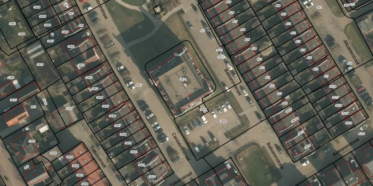 Toledostraat 13 is gelegen op kadastraal perceel LEN00A3870. Deze kadastrale aanduiding is uniek en wordt gebruikt door het Kadaster om eigendomsrechten en andere zakelijke rechten vast te leggen. Het perceel maakt onderdeel uit van de kadastrale gemeente Lent.