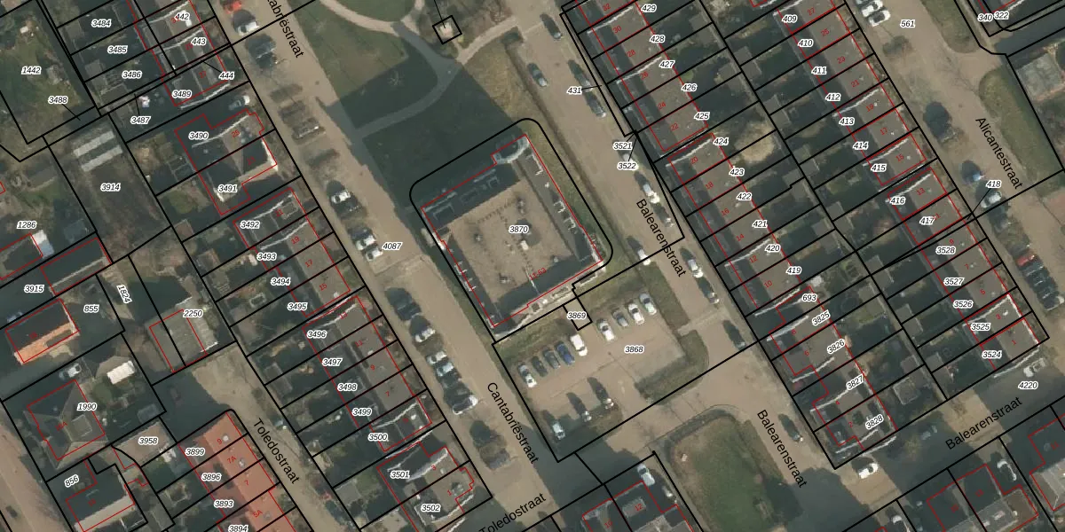 Toledostraat 15 is gelegen op kadastraal perceel LEN00A3870. Deze kadastrale aanduiding is uniek en wordt gebruikt door het Kadaster om eigendomsrechten en andere zakelijke rechten vast te leggen. Het perceel maakt onderdeel uit van de kadastrale gemeente Lent.