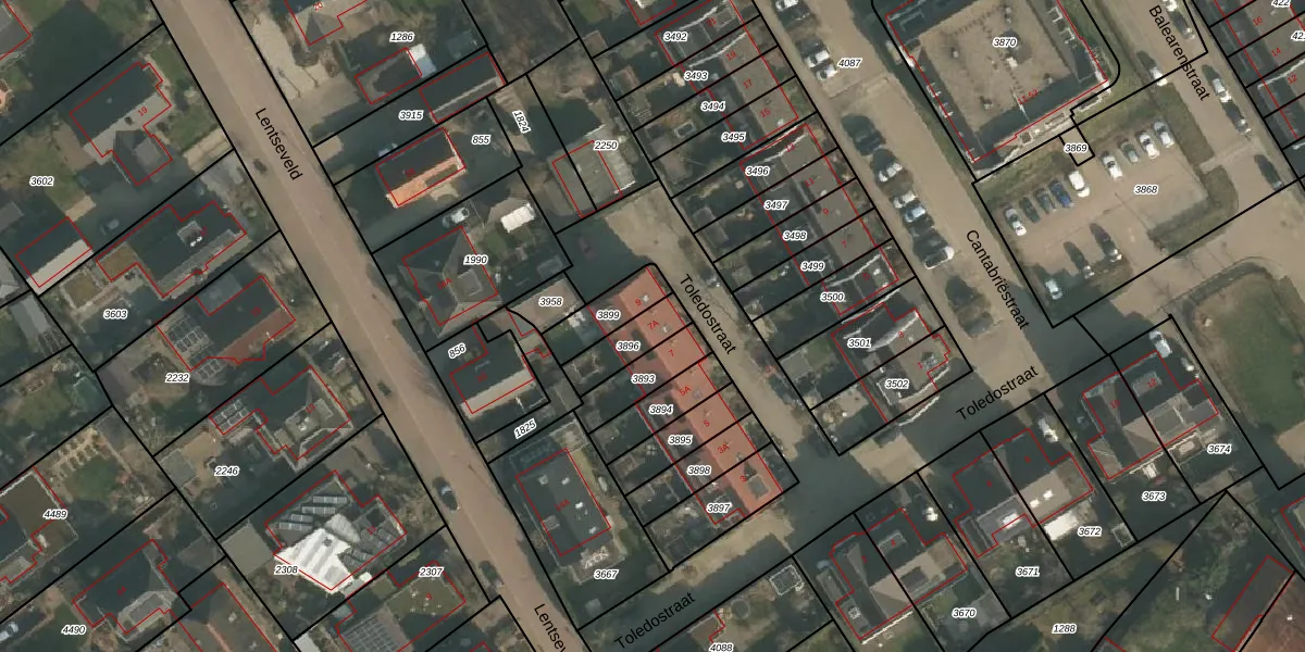 Toledostraat 7-A is gelegen op kadastraal perceel LEN00A3896. Deze kadastrale aanduiding is uniek en wordt gebruikt door het Kadaster om eigendomsrechten en andere zakelijke rechten vast te leggen. Het perceel maakt onderdeel uit van de kadastrale gemeente Lent.
