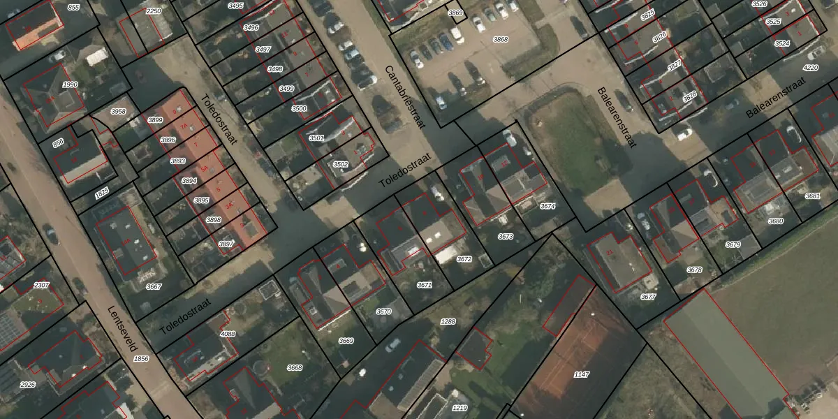 Toledostraat 8 is gelegen op kadastraal perceel LEN00A3672. Deze kadastrale aanduiding is uniek en wordt gebruikt door het Kadaster om eigendomsrechten en andere zakelijke rechten vast te leggen. Het perceel maakt onderdeel uit van de kadastrale gemeente Lent.
