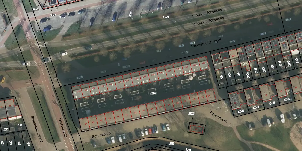 Vrouwe Udasingel 134 is gelegen op kadastraal perceel LEN00A2870. Deze kadastrale aanduiding is uniek en wordt gebruikt door het Kadaster om eigendomsrechten en andere zakelijke rechten vast te leggen. Het perceel maakt onderdeel uit van de kadastrale gemeente Lent.
