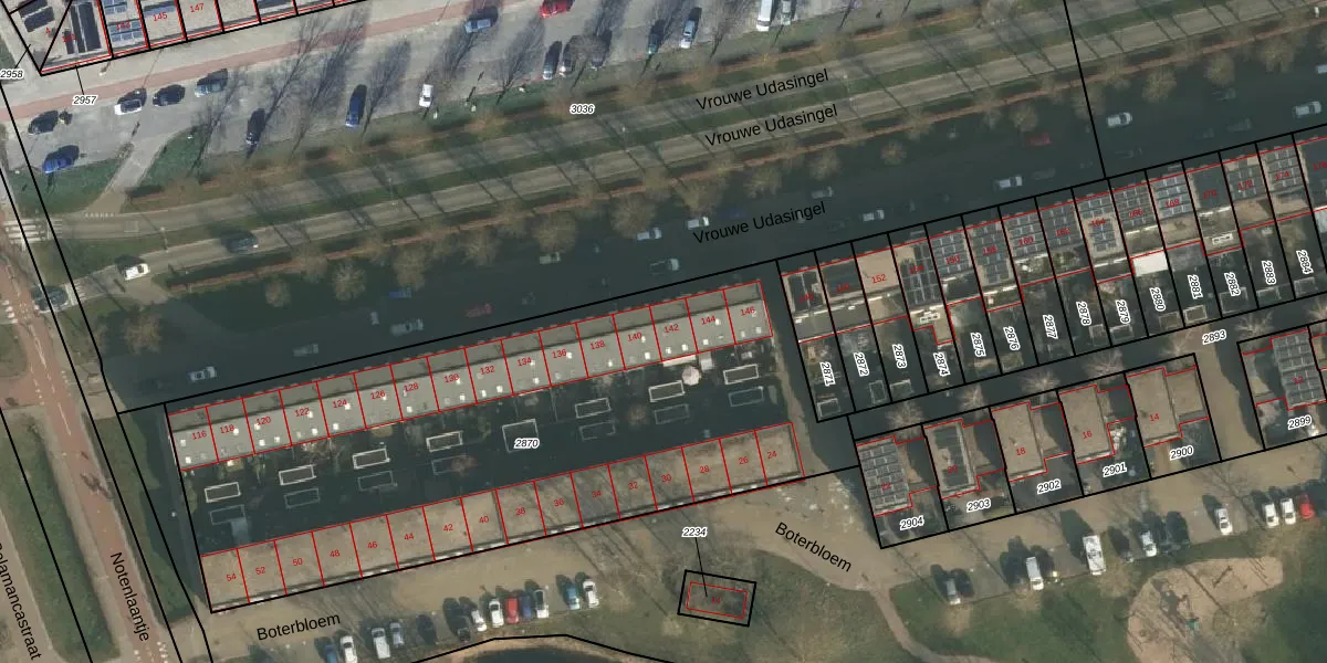 Vrouwe Udasingel 142 is gelegen op kadastraal perceel LEN00A2870. Deze kadastrale aanduiding is uniek en wordt gebruikt door het Kadaster om eigendomsrechten en andere zakelijke rechten vast te leggen. Het perceel maakt onderdeel uit van de kadastrale gemeente Lent.