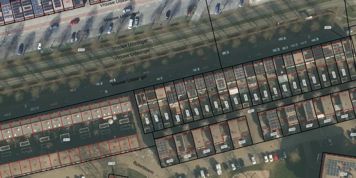 Vrouwe Udasingel 156 is gelegen op kadastraal perceel LEN00A2875. Deze kadastrale aanduiding is uniek en wordt gebruikt door het Kadaster om eigendomsrechten en andere zakelijke rechten vast te leggen. Het perceel maakt onderdeel uit van de kadastrale gemeente Lent.