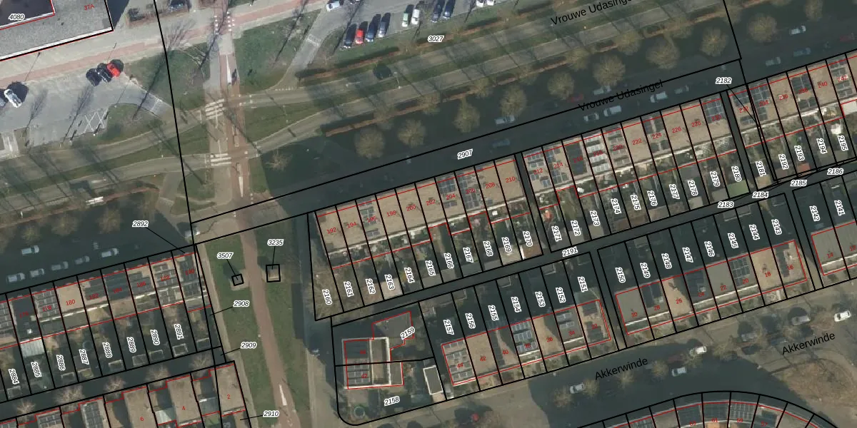 Vrouwe Udasingel 202 is gelegen op kadastraal perceel LEN00A2166. Deze kadastrale aanduiding is uniek en wordt gebruikt door het Kadaster om eigendomsrechten en andere zakelijke rechten vast te leggen. Het perceel maakt onderdeel uit van de kadastrale gemeente Lent.