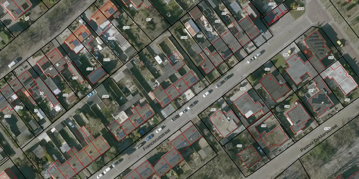 Het perceel waarop Franciscusstraat 35 staat heeft een oppervlakte van 3957 m². Dit is een zeer groot perceel. De perceeloppervlakte wordt geregistreerd door het Kadaster. Gedetailleerde informatie over de maten van dit perceel kunt u vinden in het rapport Kadastrale kaart met maatvoering van Franciscusstraat 35.