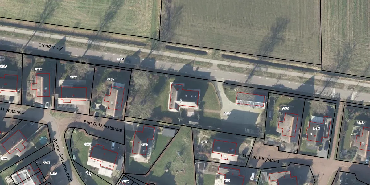 Het perceel waarop Cröddendijk 2 staat heeft een oppervlakte van 1995 m². Dit is een zeer groot perceel. De perceeloppervlakte wordt geregistreerd door het Kadaster. Gedetailleerde informatie over de maten van dit perceel kunt u vinden in het rapport Kadastrale kaart met maatvoering van Cröddendijk 2.