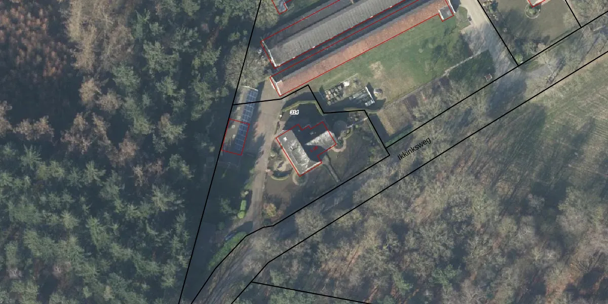 Ikkinksweg 1 is gelegen op kadastraal perceel DPV00L314. Deze kadastrale aanduiding is uniek en wordt gebruikt door het Kadaster om eigendomsrechten en andere zakelijke rechten vast te leggen. Het perceel maakt onderdeel uit van de kadastrale gemeente Diepenveen.