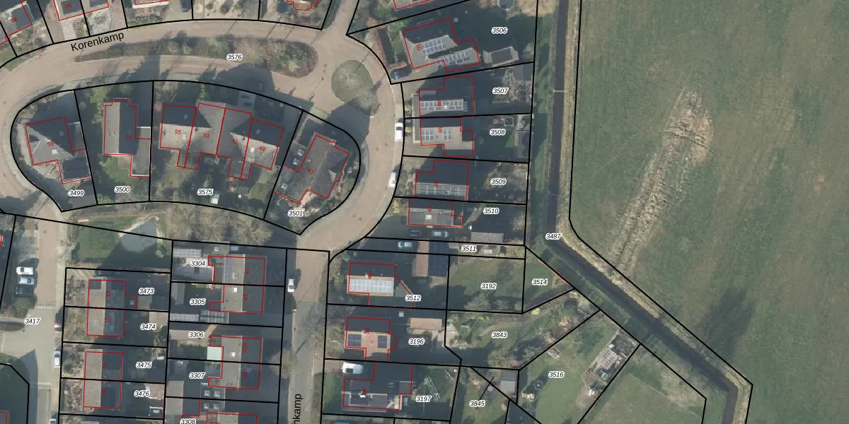 Het perceel waarop Korenkamp 42 staat heeft een oppervlakte van 336 m². Dit is een groot perceel. De perceeloppervlakte wordt geregistreerd door het Kadaster. Gedetailleerde informatie over de maten van dit perceel kunt u vinden in het rapport Kadastrale kaart met maatvoering van Korenkamp 42.