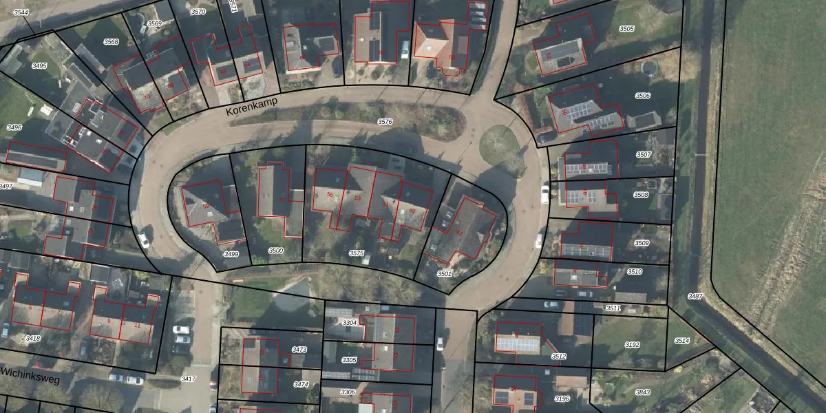 Het perceel waarop Korenkamp 49 staat heeft een oppervlakte van 897 m². Dit is een groot perceel. De perceeloppervlakte wordt geregistreerd door het Kadaster. Gedetailleerde informatie over de maten van dit perceel kunt u vinden in het rapport Kadastrale kaart met maatvoering van Korenkamp 49.