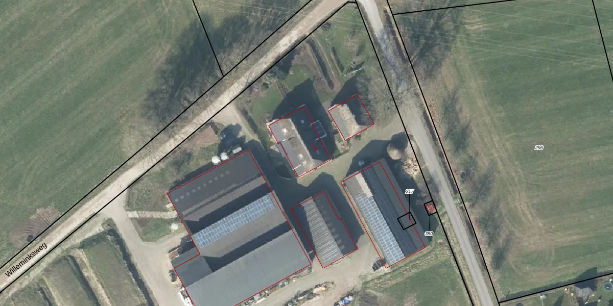 Het perceel waarop Willeminksweg 2-A staat heeft een oppervlakte van 3,8 ha. Dit is een zeer groot perceel. De perceeloppervlakte wordt geregistreerd door het Kadaster. Gedetailleerde informatie over de maten van dit perceel kunt u vinden in het rapport Kadastrale kaart met maatvoering van Willeminksweg 2-A.