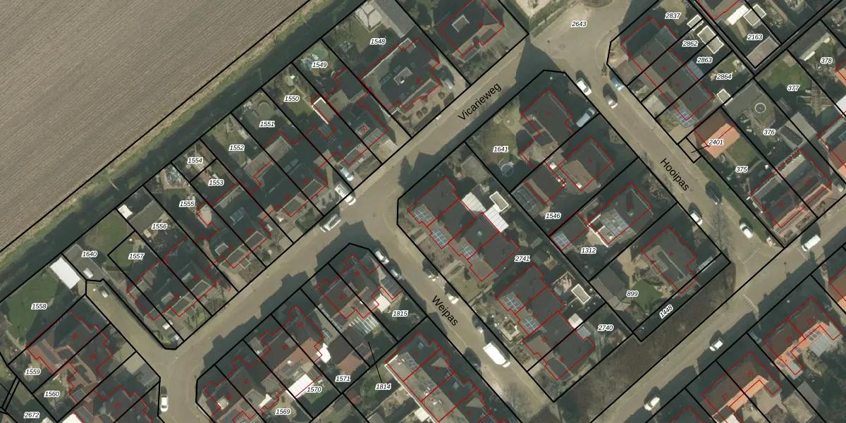 Het perceel waarop Weipas 1 staat heeft een oppervlakte van 1249 m². Dit is een zeer groot perceel. De perceeloppervlakte wordt geregistreerd door het Kadaster. Gedetailleerde informatie over de maten van dit perceel kunt u vinden in het rapport Kadastrale kaart met maatvoering van Weipas 1.