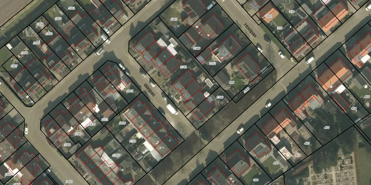 Het perceel waarop Weipas 11 staat heeft een oppervlakte van 1249 m². Dit is een zeer groot perceel. De perceeloppervlakte wordt geregistreerd door het Kadaster. Gedetailleerde informatie over de maten van dit perceel kunt u vinden in het rapport Kadastrale kaart met maatvoering van Weipas 11.