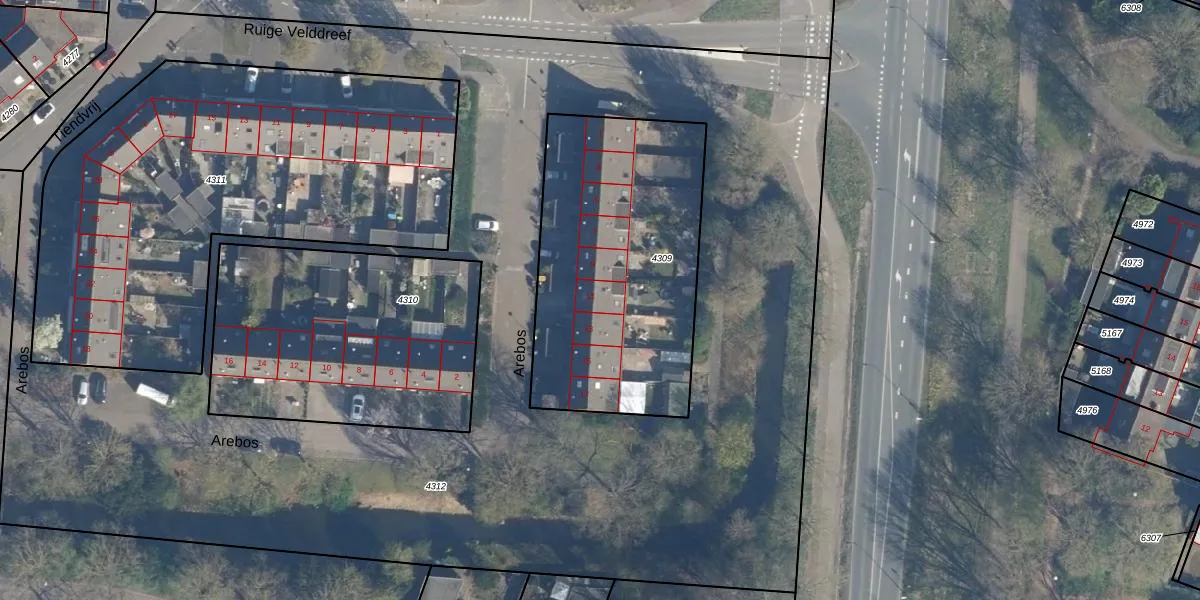 Het perceel waarop Arebos 11 staat heeft een oppervlakte van 1303 m². Dit is een zeer groot perceel. De perceeloppervlakte wordt geregistreerd door het Kadaster. Gedetailleerde informatie over de maten van dit perceel kunt u vinden in het rapport Kadastrale kaart met maatvoering van Arebos 11.