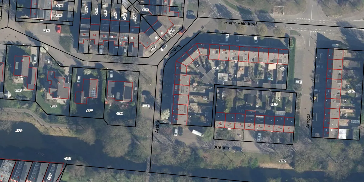 Het perceel waarop Arebos 24 staat heeft een oppervlakte van 2410 m². Dit is een zeer groot perceel. De perceeloppervlakte wordt geregistreerd door het Kadaster. Gedetailleerde informatie over de maten van dit perceel kunt u vinden in het rapport Kadastrale kaart met maatvoering van Arebos 24.