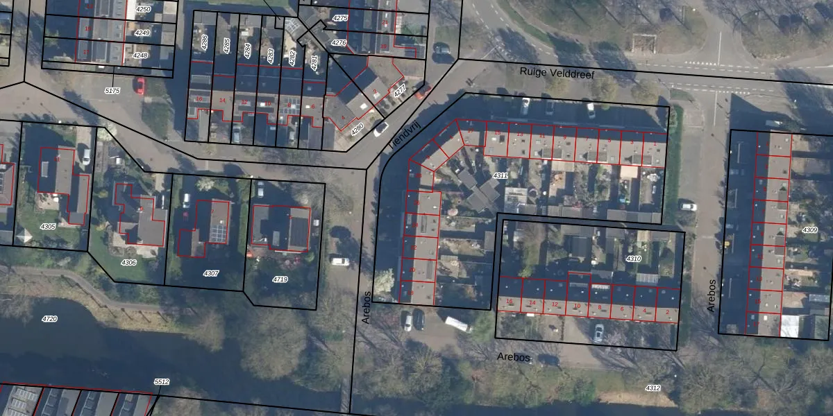 Het perceel waarop Arebos 26 staat heeft een oppervlakte van 2410 m². Dit is een zeer groot perceel. De perceeloppervlakte wordt geregistreerd door het Kadaster. Gedetailleerde informatie over de maten van dit perceel kunt u vinden in het rapport Kadastrale kaart met maatvoering van Arebos 26.