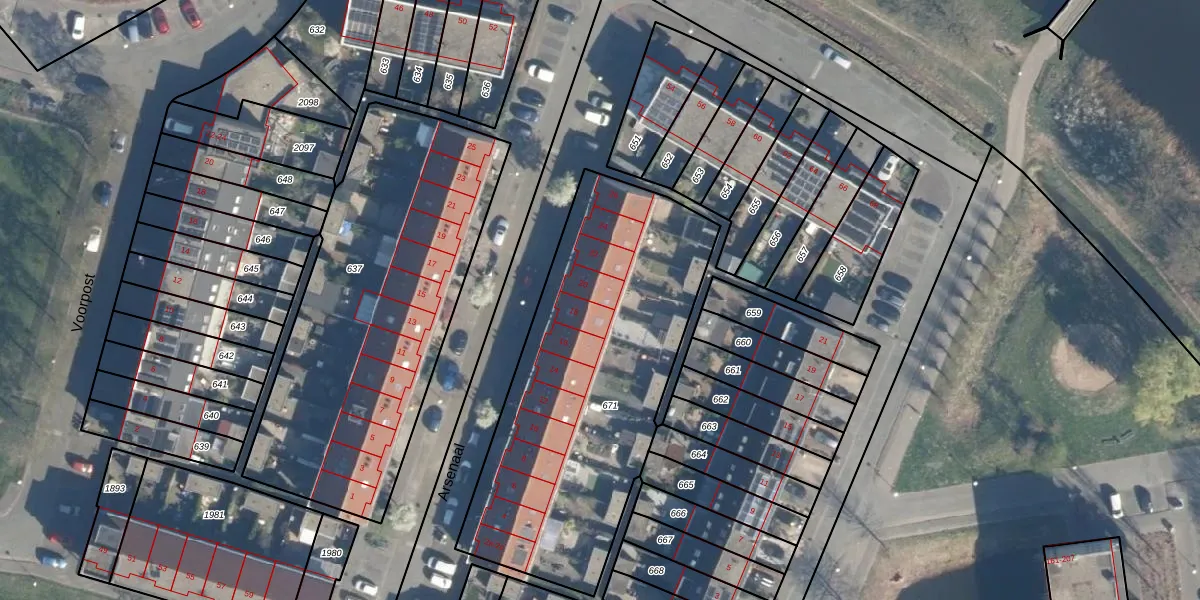 Het perceel waarop Arsenaal 20 staat heeft een oppervlakte van 1640 m². Dit is een zeer groot perceel. De perceeloppervlakte wordt geregistreerd door het Kadaster. Gedetailleerde informatie over de maten van dit perceel kunt u vinden in het rapport Kadastrale kaart met maatvoering van Arsenaal 20.