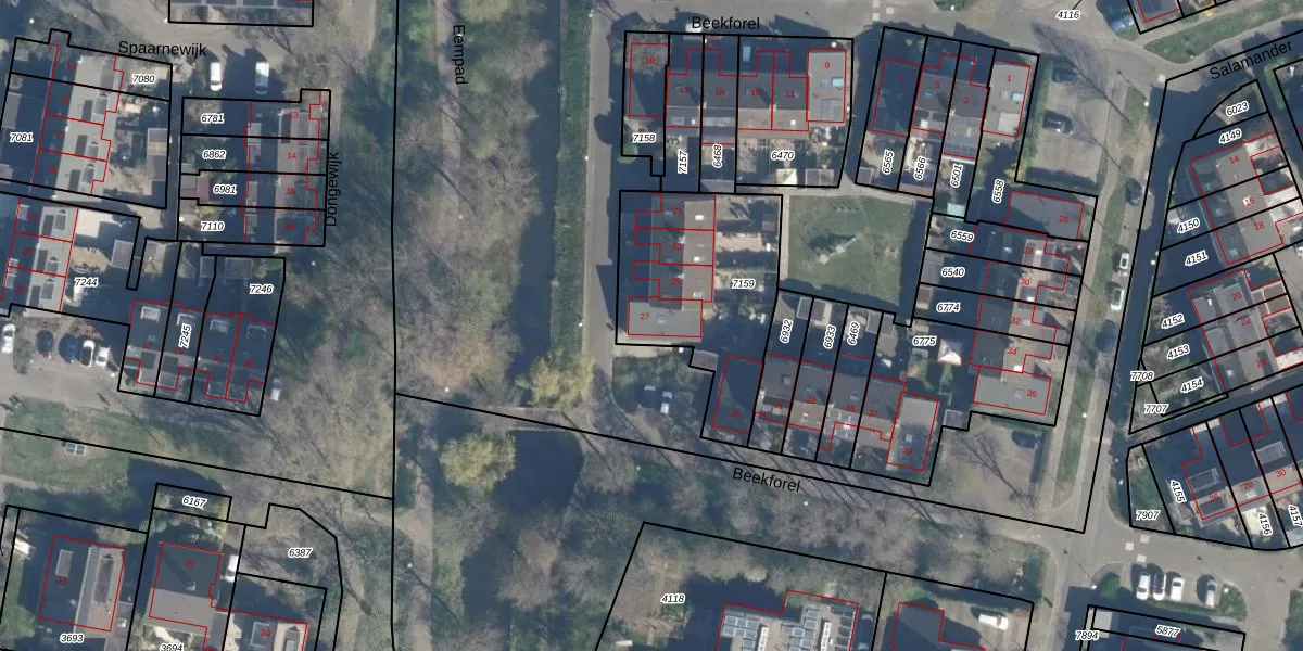 Het perceel waarop Beekforel 27 staat heeft een oppervlakte van 697 m². Dit is een groot perceel. De perceeloppervlakte wordt geregistreerd door het Kadaster. Gedetailleerde informatie over de maten van dit perceel kunt u vinden in het rapport Kadastrale kaart met maatvoering van Beekforel 27.