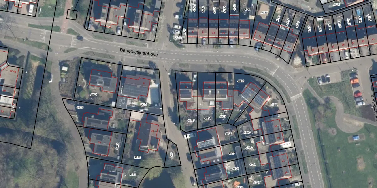 Het perceel waarop Benedictijnenhove 8 staat heeft een oppervlakte van 340 m². Dit is een groot perceel. De perceeloppervlakte wordt geregistreerd door het Kadaster. Gedetailleerde informatie over de maten van dit perceel kunt u vinden in het rapport Kadastrale kaart met maatvoering van Benedictijnenhove 8.
