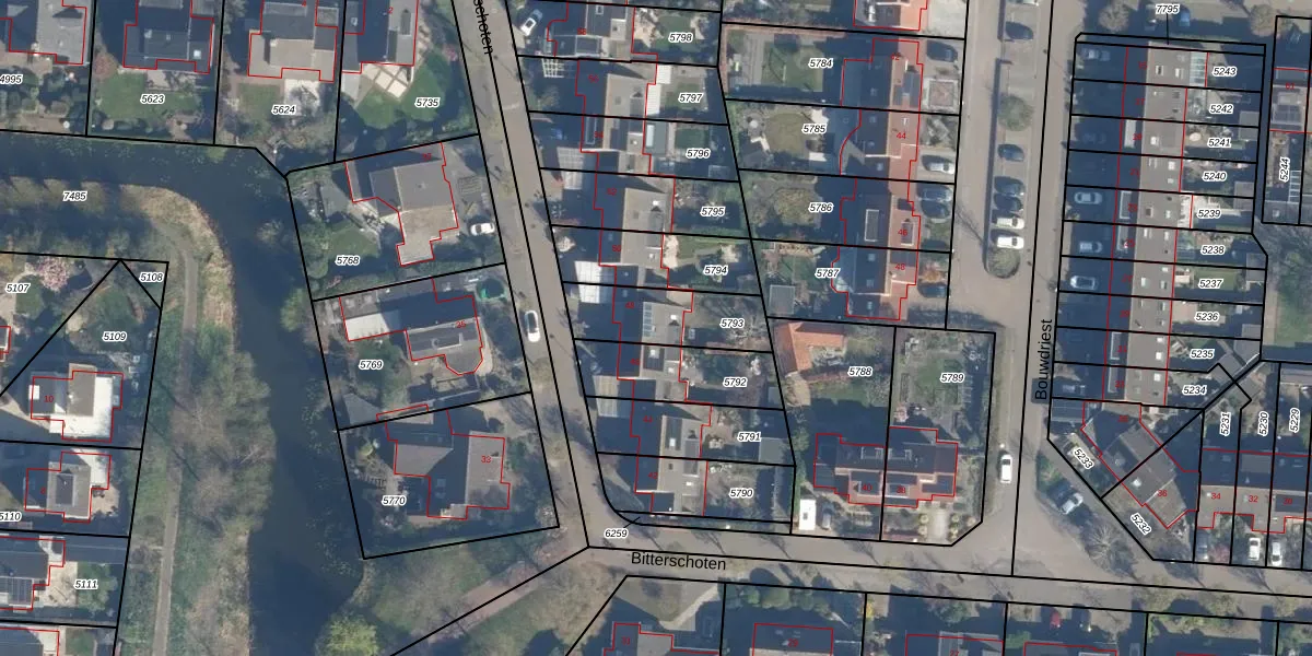 Het perceel waarop Bitterschoten 48 staat heeft een oppervlakte van 260 m². Dit is een middelgroot perceel. De perceeloppervlakte wordt geregistreerd door het Kadaster. Gedetailleerde informatie over de maten van dit perceel kunt u vinden in het rapport Kadastrale kaart met maatvoering van Bitterschoten 48.