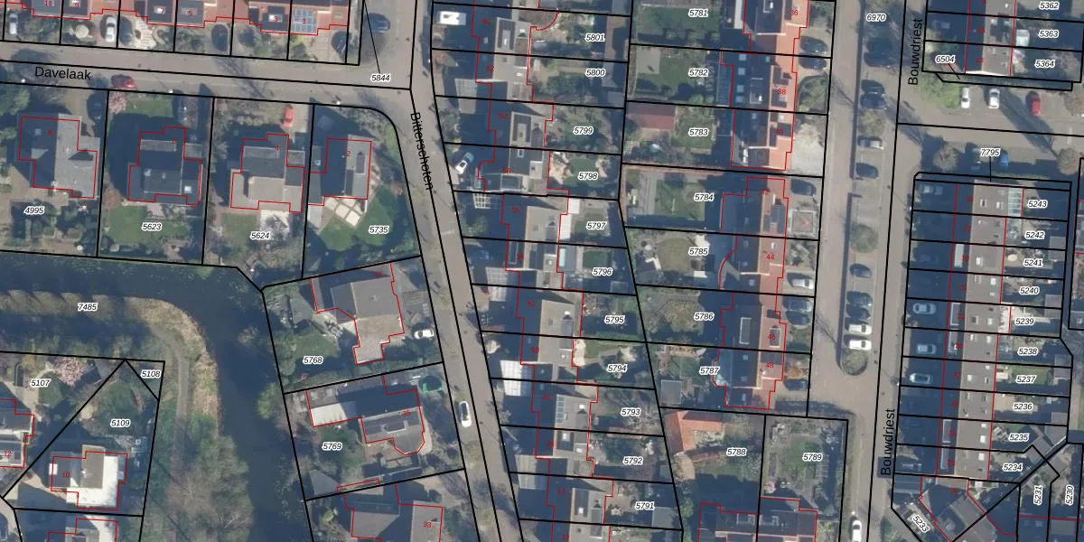 Het perceel waarop Bitterschoten 54 staat heeft een oppervlakte van 262 m². Dit is een middelgroot perceel. De perceeloppervlakte wordt geregistreerd door het Kadaster. Gedetailleerde informatie over de maten van dit perceel kunt u vinden in het rapport Kadastrale kaart met maatvoering van Bitterschoten 54.