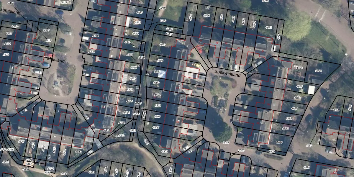Boekweitland 13 is gelegen op kadastraal perceel LDN02E4500. Deze kadastrale aanduiding is uniek en wordt gebruikt door het Kadaster om eigendomsrechten en andere zakelijke rechten vast te leggen. Het perceel maakt onderdeel uit van de kadastrale gemeente Leusden.